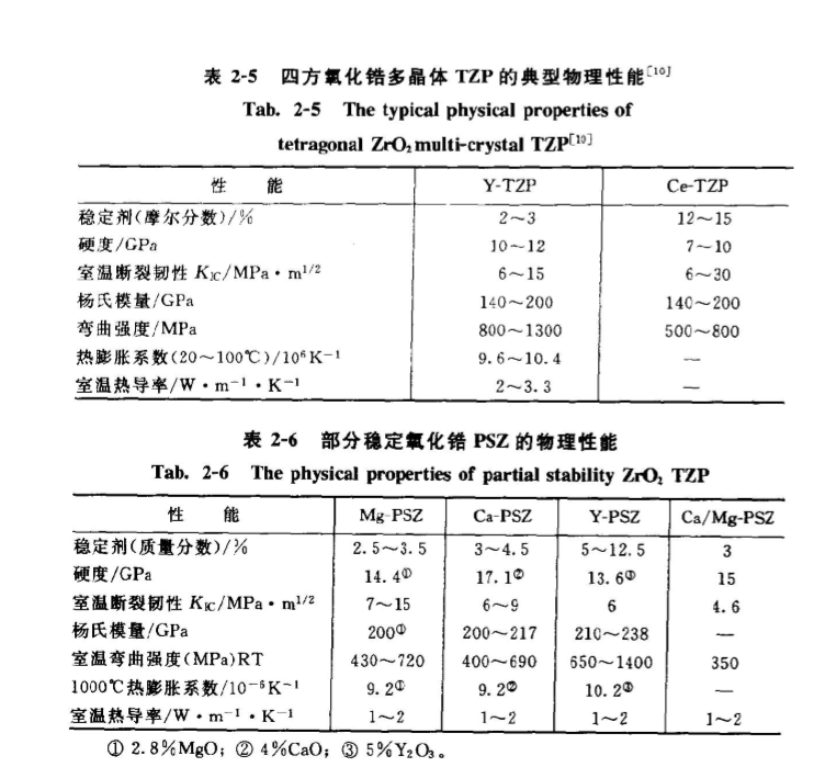 商業氧化鋯陶瓷的典型物理性能示于表2-5、表2-6。表中所得到的某一特性數據與實驗方法有關,特別是Kc值。而且這些常用數據會受到顯微結構變化(如穩定劑含量、晶粒尺寸等)和外界條件變化(如氣氛、溫度)的影響。使用時僅供參考。
