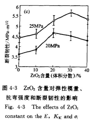 如圖4-3所示,壓力較低時,斷裂強(qiáng)度隨ZrO2含量的增加而增加,與其密度的變化趨勢相一致,這說明此時影響斷裂強(qiáng)度的主要因素是材料的度。壓力為25MPa且降溫保壓所制得材料的斷裂強(qiáng)度存在一個大值,之后隨ZrO2含量的增加反而降低,據(jù)此推斷,此時對斷裂強(qiáng)度產(chǎn)生損害的是Al2O3/cZrO2之間熱膨脹差引起的拉應(yīng)力及微裂紋。