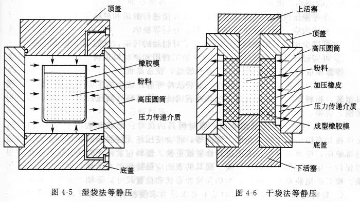 干袋法等靜壓成型,加壓橡皮模是事先放入缸體內(nèi)的,工作時(shí)不敢出。粉料裝入成型橡皮模后,一起放進(jìn)加壓橡皮模內(nèi),或?qū)⒎哿蠌纳厦嫱ㄟ^進(jìn)料斗,送至加壓橡皮模中,成型橡皮模是與液體介質(zhì)不相接觸的,因此稱為干袋法。這種方法可以實(shí)現(xiàn)連續(xù)操作,把上蓋打開,從料斗中裝料,然后蓋好上蓋,加壓成型。出坯時(shí),把上蓋打開,通過底部的頂棒把坯件從上面頂出來。干袋法自動(dòng)程度高,操作周期短,適用于大批量生產(chǎn),但因加壓橡皮模不易經(jīng)常更換,成型的產(chǎn)品尺寸和形狀受到限制。干袋法等靜壓的模具及坯料的放置方式如圖4-6所示。